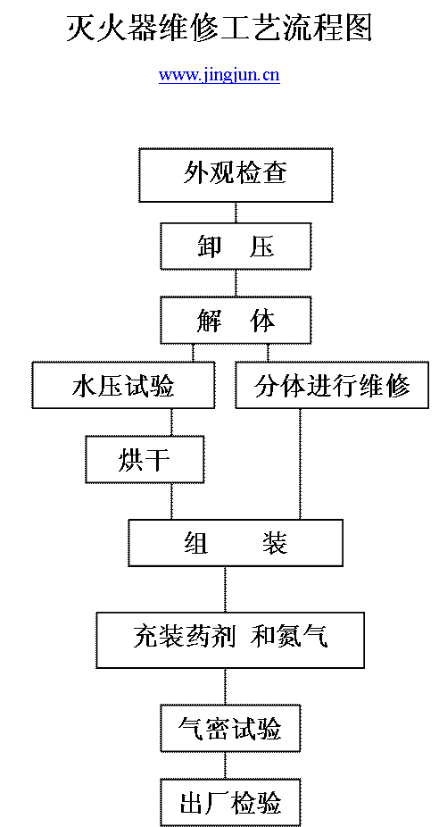 外觀檢查--卸壓--解體--水壓試驗(yàn)--分體進(jìn)行維修--筒體烘干--組裝--充裝藥劑、氮?dú)?SPAN lang=EN-US>--氣密試驗(yàn)--出廠(chǎng)檢驗(yàn);維修滅火器(年檢)包括: 1,滅火器檢測(cè)(卸壓打開(kāi)滅火器檢測(cè)器頭、閥門(mén)、虹吸管、壓力表性能是否正常,并更換損壞的配件);2,滅火器筒體水壓試驗(yàn),測(cè)試滅火器筒體在2.5MP的壓力下是否變形報(bào)廢,檢測(cè)滅火器筒體是否銹化腐蝕;3,烘干滅火器筒體;4,重新灌裝滅火藥劑并稱(chēng)重計(jì)量,更換變質(zhì)的滅火藥劑;5,重新充裝驅(qū)動(dòng)氣體氮?dú)鈮海?/SPAN>6,密封器頭后做噴射性能檢查、氣密性能檢查;7,滅火器筒體外部的清潔清洗;8,貼當(dāng)?shù)叵谰终J(rèn)可的 滅火器維修年檢合格證 標(biāo)簽